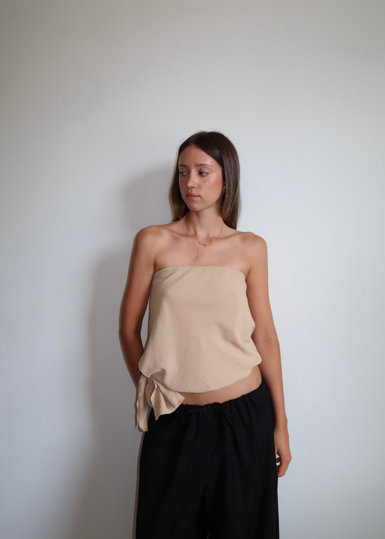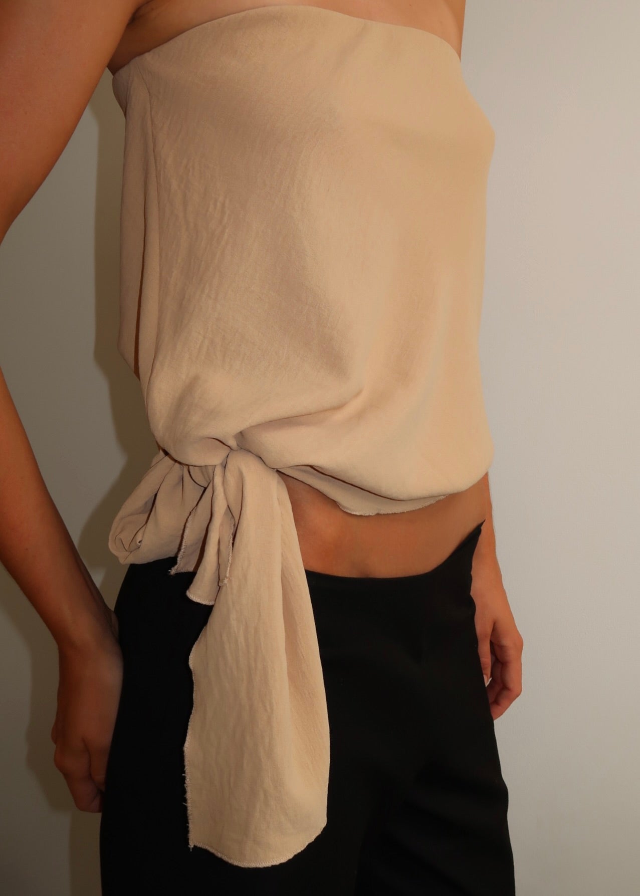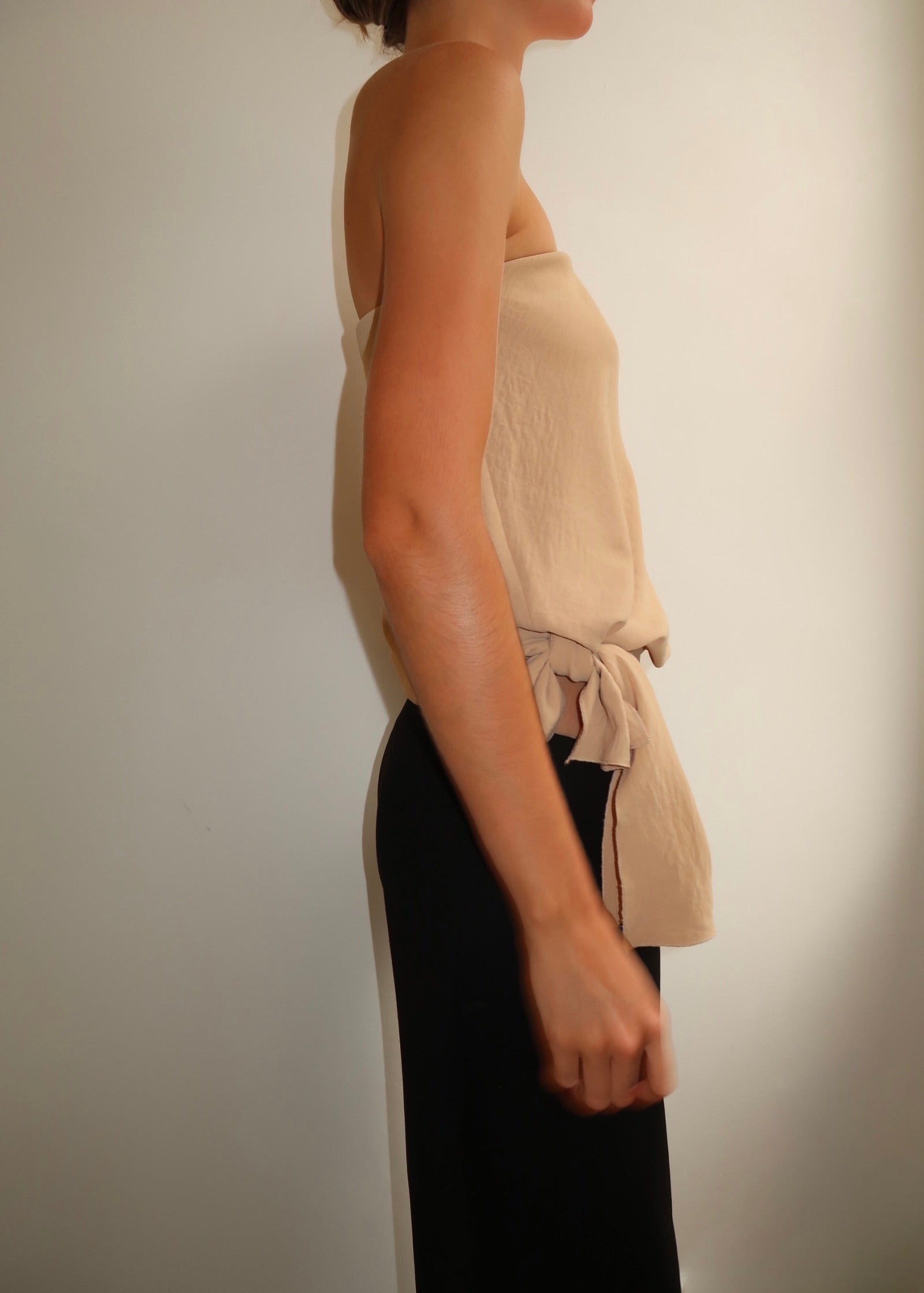 The Chloe bodice is a strapless bodice made from a lightweight fabric. Cut on the bias, giving it natural stretch and drape. Designed with elastic on the upper bust for a flexible, comfortable fit. Featuring a gathered waist and adjustable side tie, which can be styled low on the waist or tied higher.