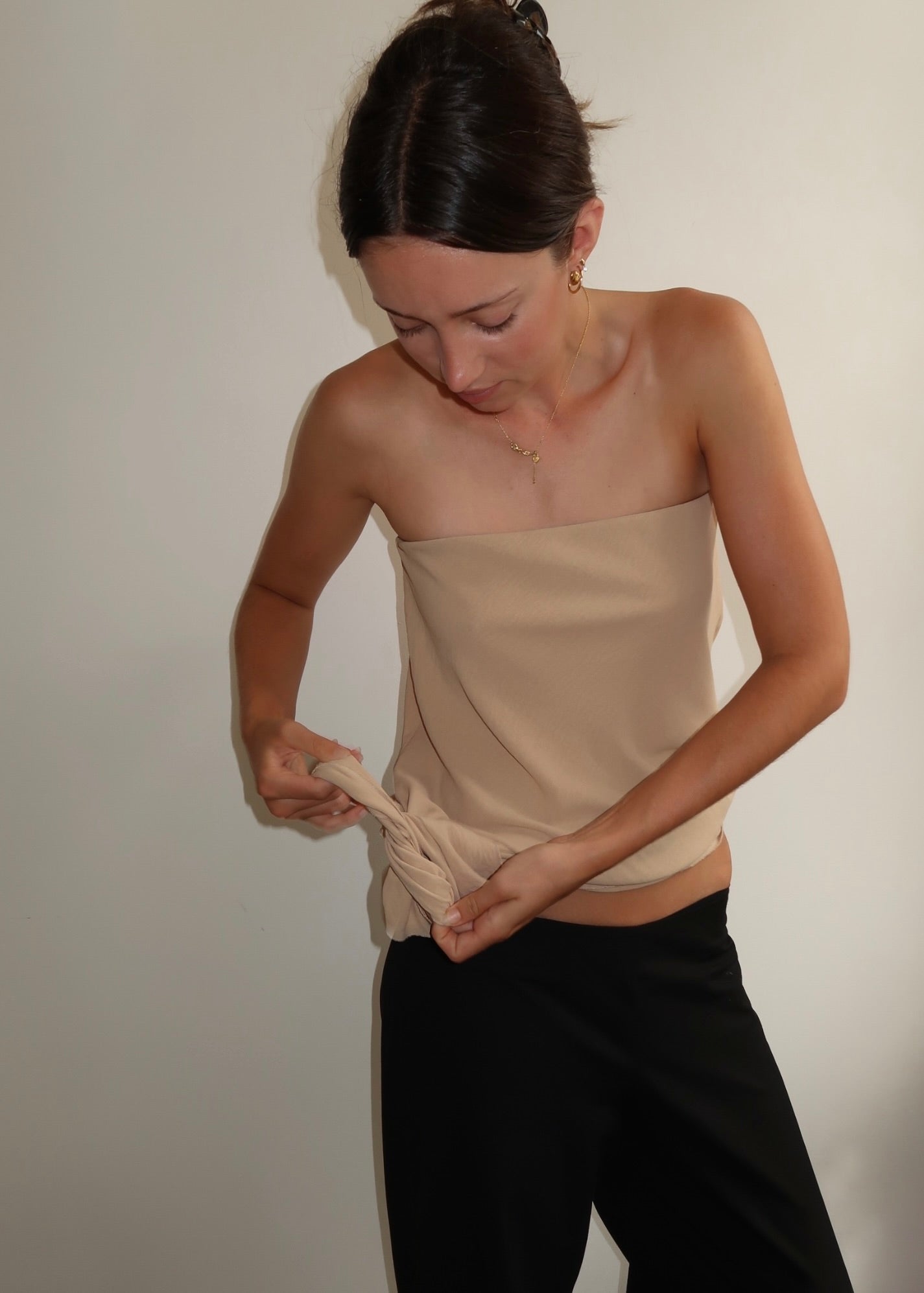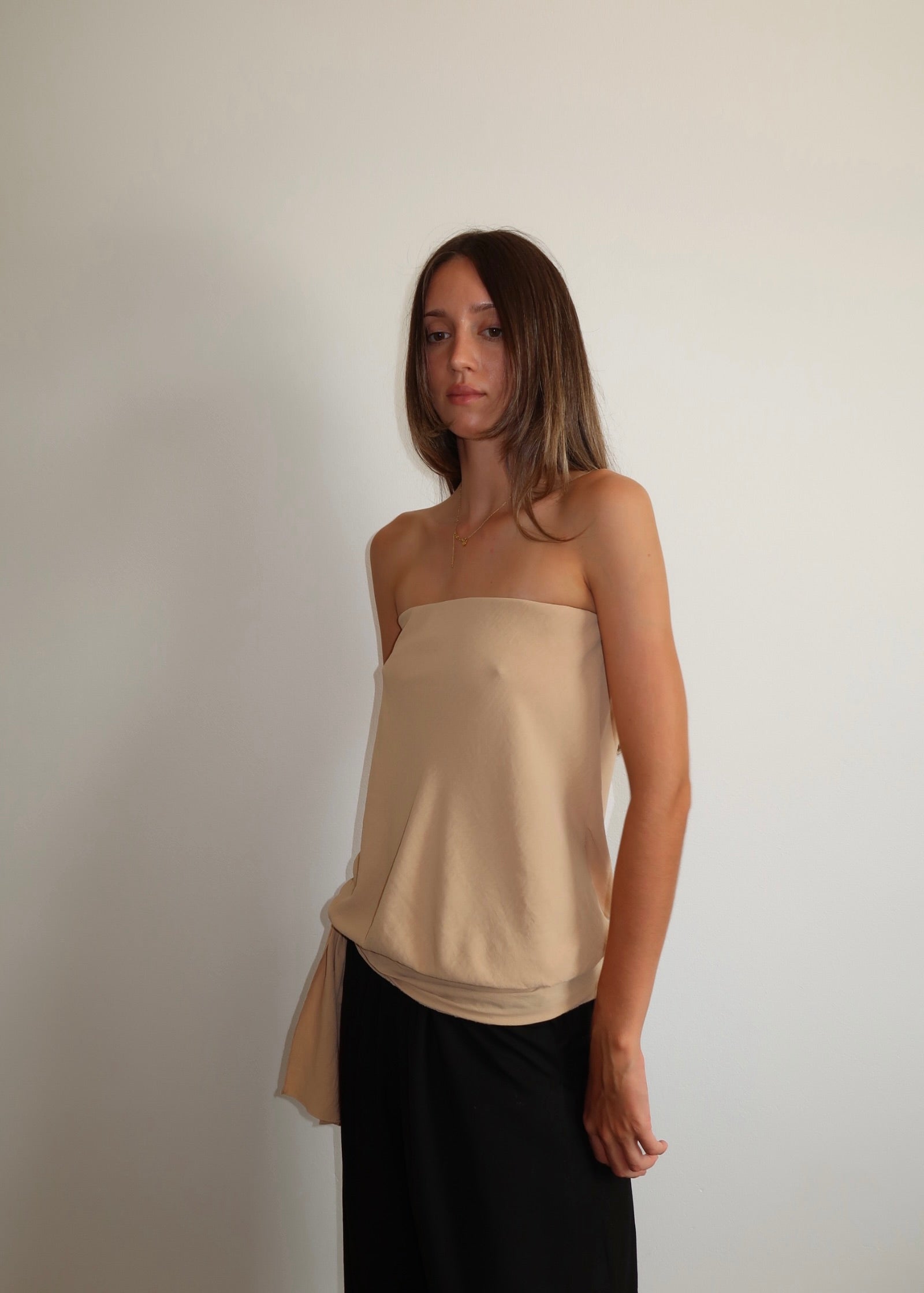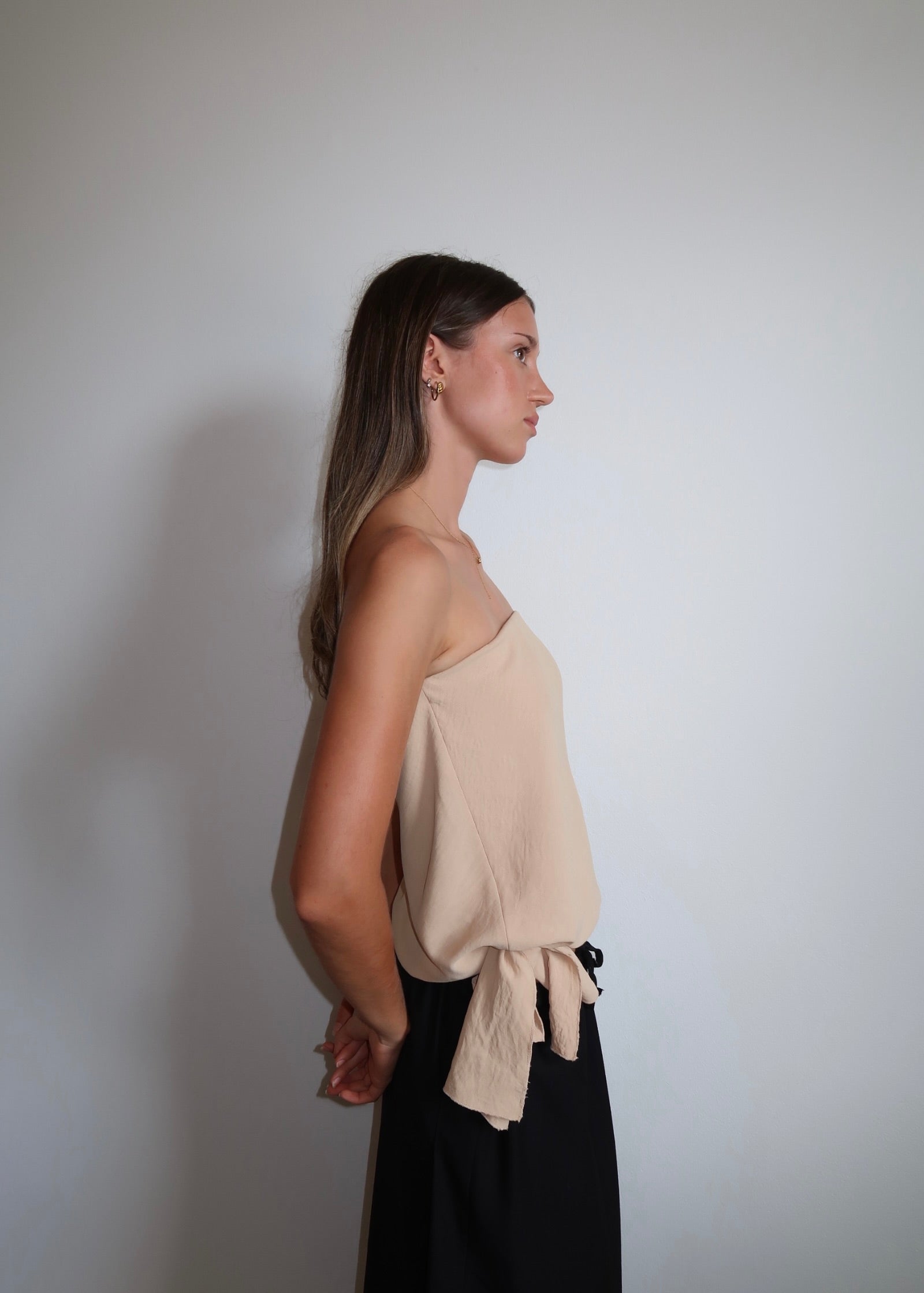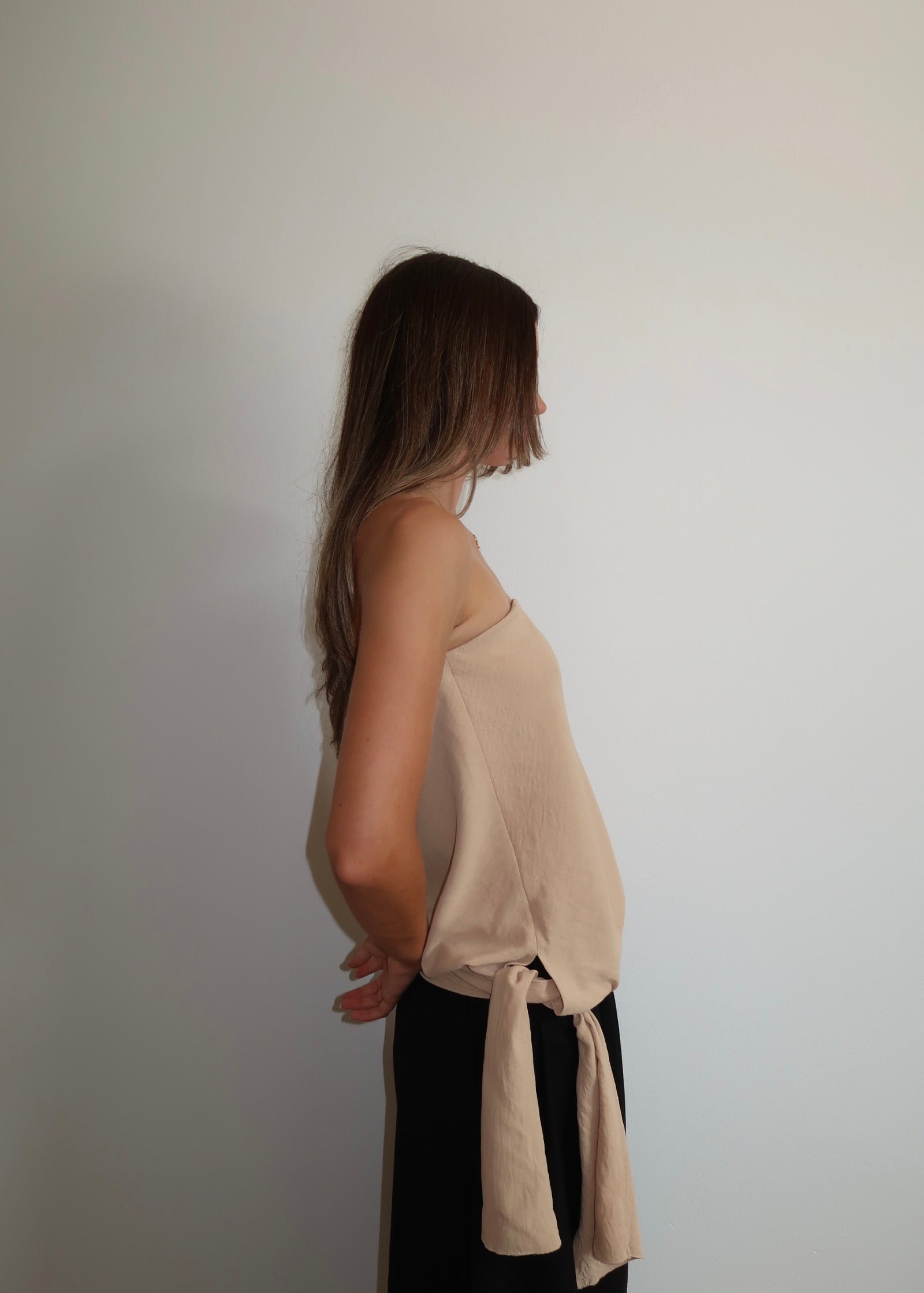 The Chloe bodice is a strapless bodice made from a lightweight fabric. Cut on the bias, giving it natural stretch and drape. Designed with elastic on the upper bust for a flexible, comfortable fit. Featuring a gathered waist and adjustable side tie, which can be styled low on the waist or tied higher.